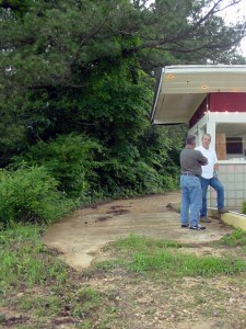 If you look to the left of the ticket booth, you'll notice a concrete pad sitting next to the edge of the entrance lane. When Mr. Curtis took over the property, awnings covered both entrance lanes and were supported by pillars set into the slots in the concrete pads. Sadly, the awnings were too far gone to be saved and they were removed to improve the look of the property.